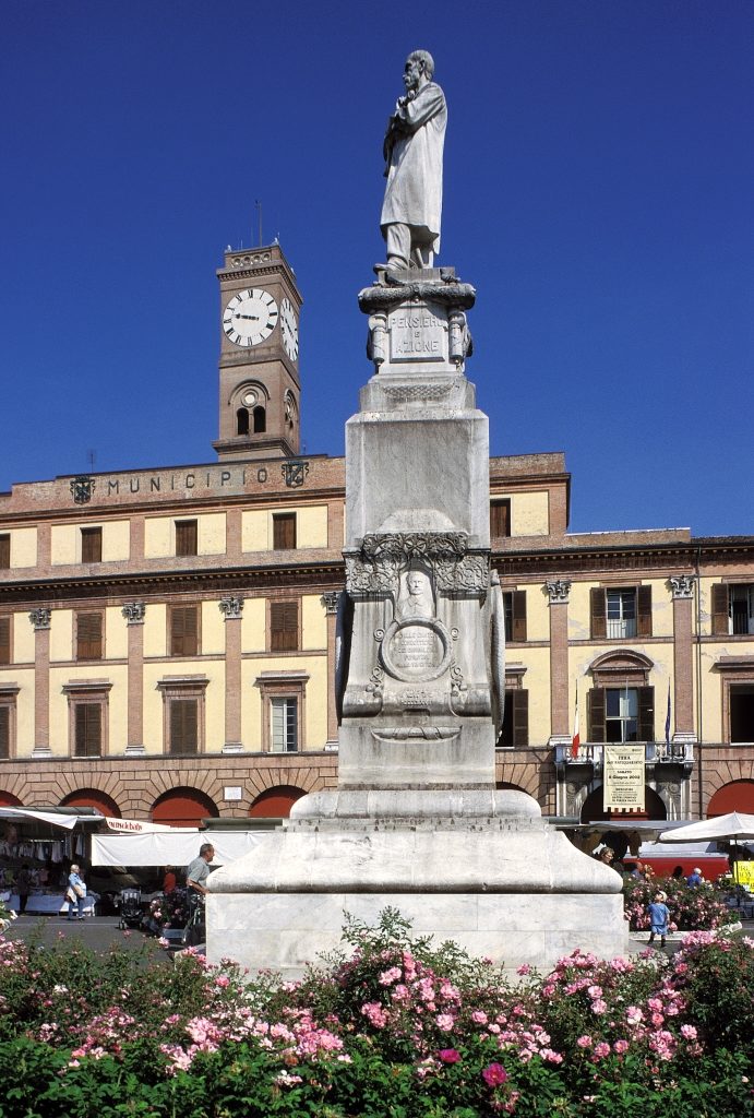 Non si poteva lasciare la piazza senza un gelato e senza salutare Saffi, gloria cittadina, coraggioso triunviro della Repubblica Romana.. io mi chiedevo solo perchè se ne stesse lassù così imbronciato, una mano sotto al mento. Sicuramente perchè nessuno si ricordava di lui, stava troppo in alto, e l’unico che passava a salutarlo ero io e quel piccione fisso in cima alla testa che ogni giorno gli dava un pò di tormento e un pò di compagnia.